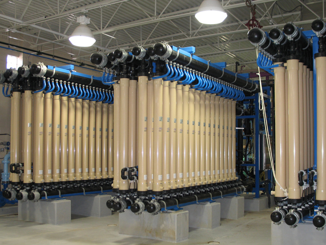 The plant uses ferric chloride to bind the arsenic, which can then be strained out of the water using micro-filters that are housed in 210 tubular modules. The micro-filters, which look like bundles of spaghetti, are actually membranes with pores 10 times smaller than a bacterium. The surface area of these membranes totals about 2.5 acres. Water entering the plant is typically about 30 ppb, but it is less than 4 ppb when it leaves.
